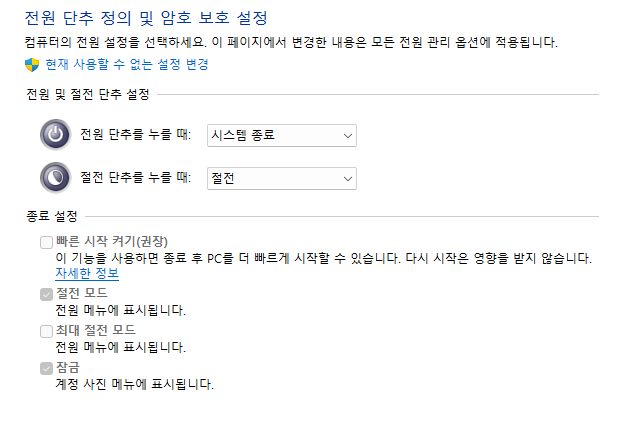 제어판 - 시스템 및 보안 - 전원 옵션 - 전원 단추 작동 설정에서 아래와 같은 사진이 기본값입니다.